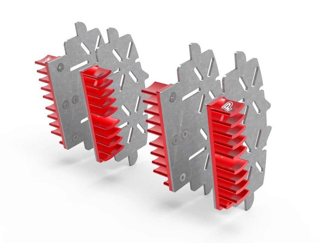 The project have been carried out after a year of testing and comparisons done right on track before the final version release. The heat sinks have been designed using two different metal elements to optimize the pad's thermal insulation by the caliper and the cooling thereof. The main body of the heat sink is made of thermal steel with a high degree of heat conductivity. The material is first laser cut and then CNC machined. The slots have two purposes: first is to reduce the contact surface, second - to release the hot air formed inside the brake piston cavity by reducing the hot chamber effect, as the propagation of heat in the piston and oil. The steel sink's main body is connected to a light alloy heat sink made of special aluminum with high thermal conductivity, which has the task of assisting the heat dissipation process.