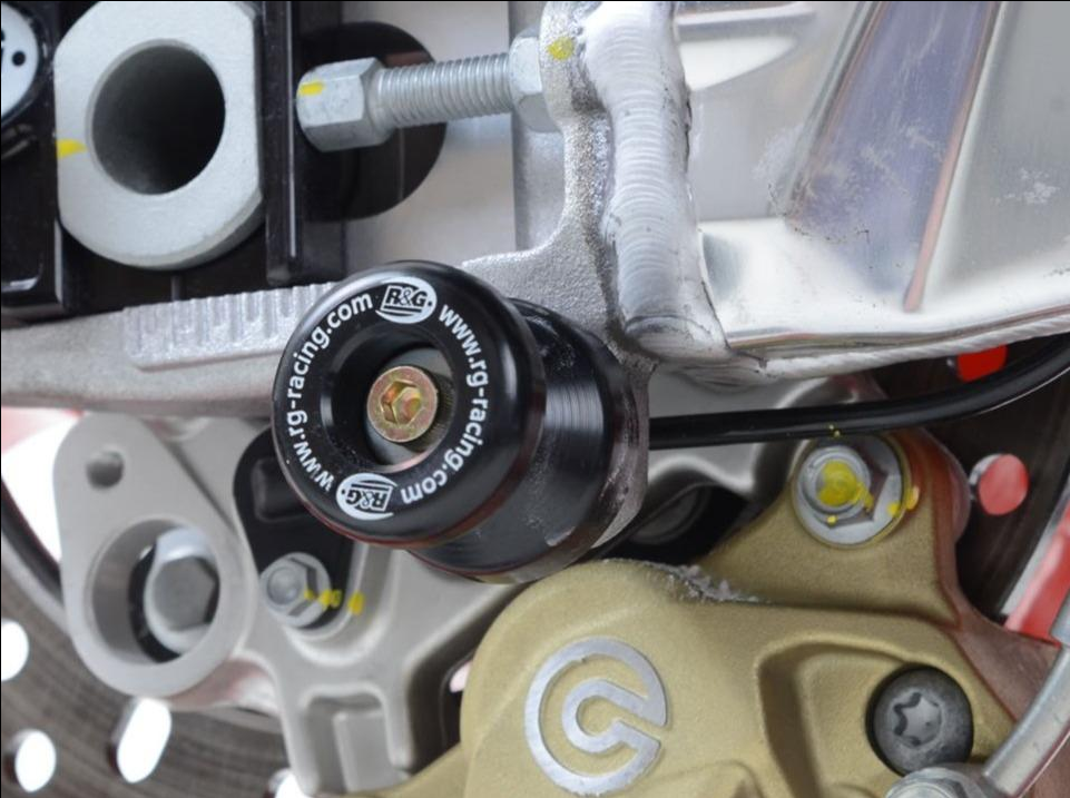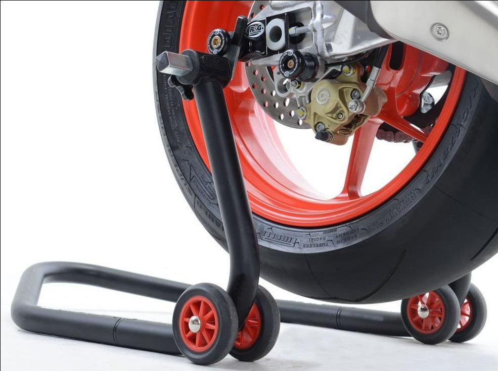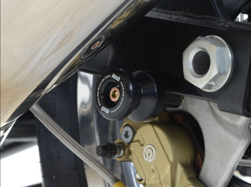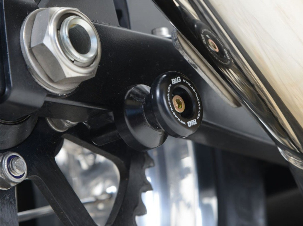 R&G Racing cotton reels locate on the paddock stand mounting points on the rear swingarm, offering protection and functionality in one product.