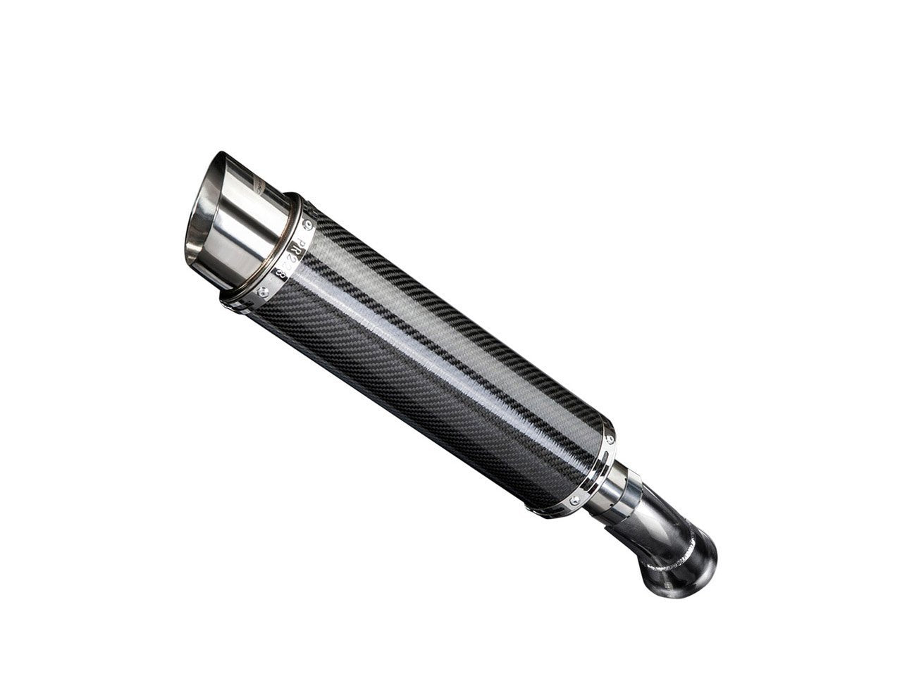 - This DL10 14 inch round carbon fiber muffler has a round composite carbon fiber sleeve with a mirror finish stainless steel end cap. This design uses the immensely popular mini muffler's slash cut polished outlet but with the internals of the British Standard road legal silencer with the baffle in. Aso this muffler includes a removable baffle / DB killer giving more free flow of the exhaust gases (more BHP) and a deeper more throaty sound when removed.