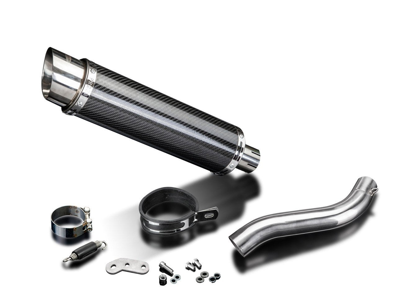 - This DL10 14 inch round carbon fiber muffler has a round composite carbon fiber sleeve with a mirror finish stainless steel end cap. This design uses the immensely popular mini muffler's slash cut polished outlet but with the internals of the British Standard road legal silencer with the baffle in. Aso this muffler includes a removable baffle / DB killer giving more free flow of the exhaust gases (more BHP) and a deeper more throaty sound when removed.