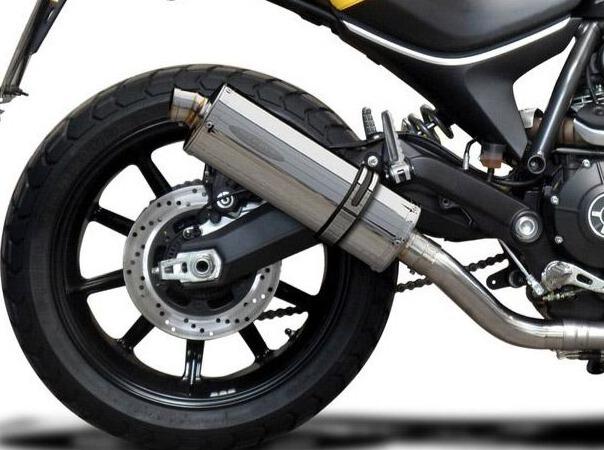 Stubby 14" stainless steel oval muffler for Ducati Scrambler 800 models by Delkevic.