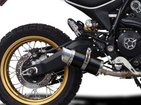 Mini 8" carbon fiber round muffler for Ducati Scrambler 800 Desert Sled by Delkevic.