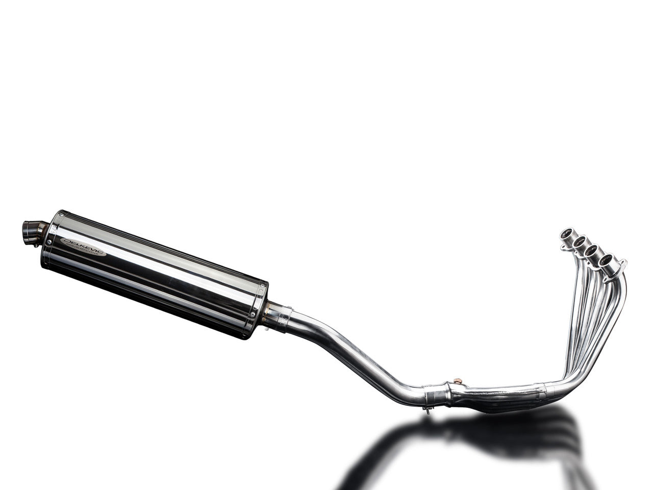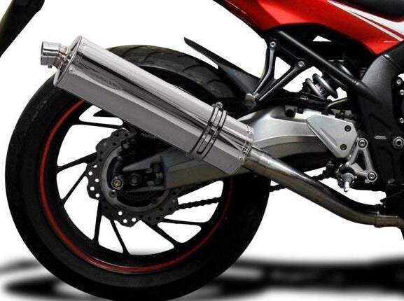 Complete exhaust system with Stubby 18" stainless steel oval muffler and stainless steel 4-1 headers for Honda CB650F / CBR650F by Delkevic.