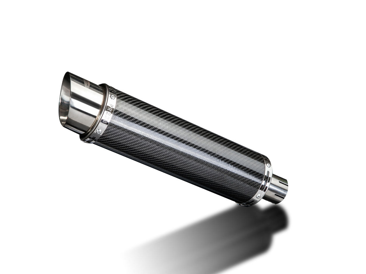 - This DL10 14 inch round carbon fiber muffler has a round composite carbon fiber sleeve with a mirror finish stainless steel end cap. This design uses the immensely popular mini muffler's slash cut polished outlet but with the internals of the British Standard road legal silencer with the baffle in. Aso this muffler includes a removable baffle / DB killer giving more free flow of the exhaust gases (more BHP) and a deeper more throaty sound when removed.
