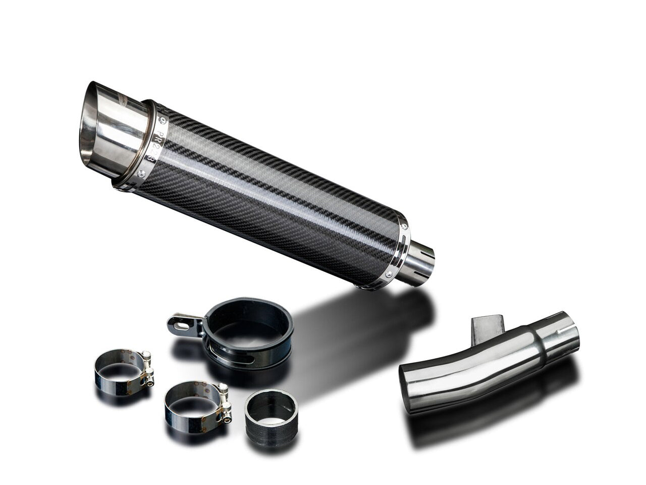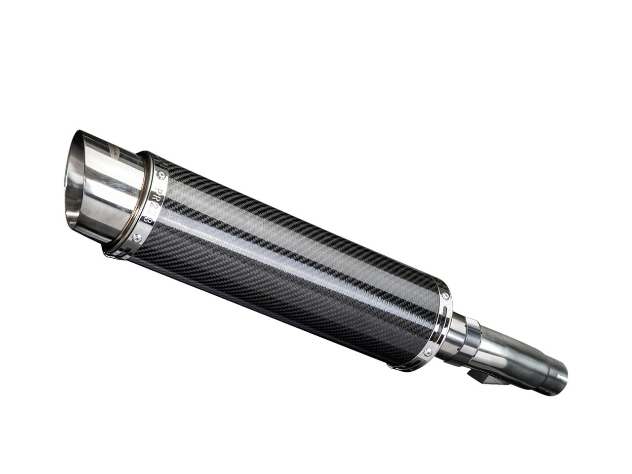 - This DL10 14 inch round carbon fiber muffler has a round composite carbon fiber sleeve with a mirror finish stainless steel end cap. This design uses the immensely popular mini muffler's slash cut polished outlet but with the internals of the British Standard road legal silencer with the baffle in. Aso this muffler includes a removable baffle / DB killer giving more free flow of the exhaust gases (more BHP) and a deeper more throaty sound when removed.