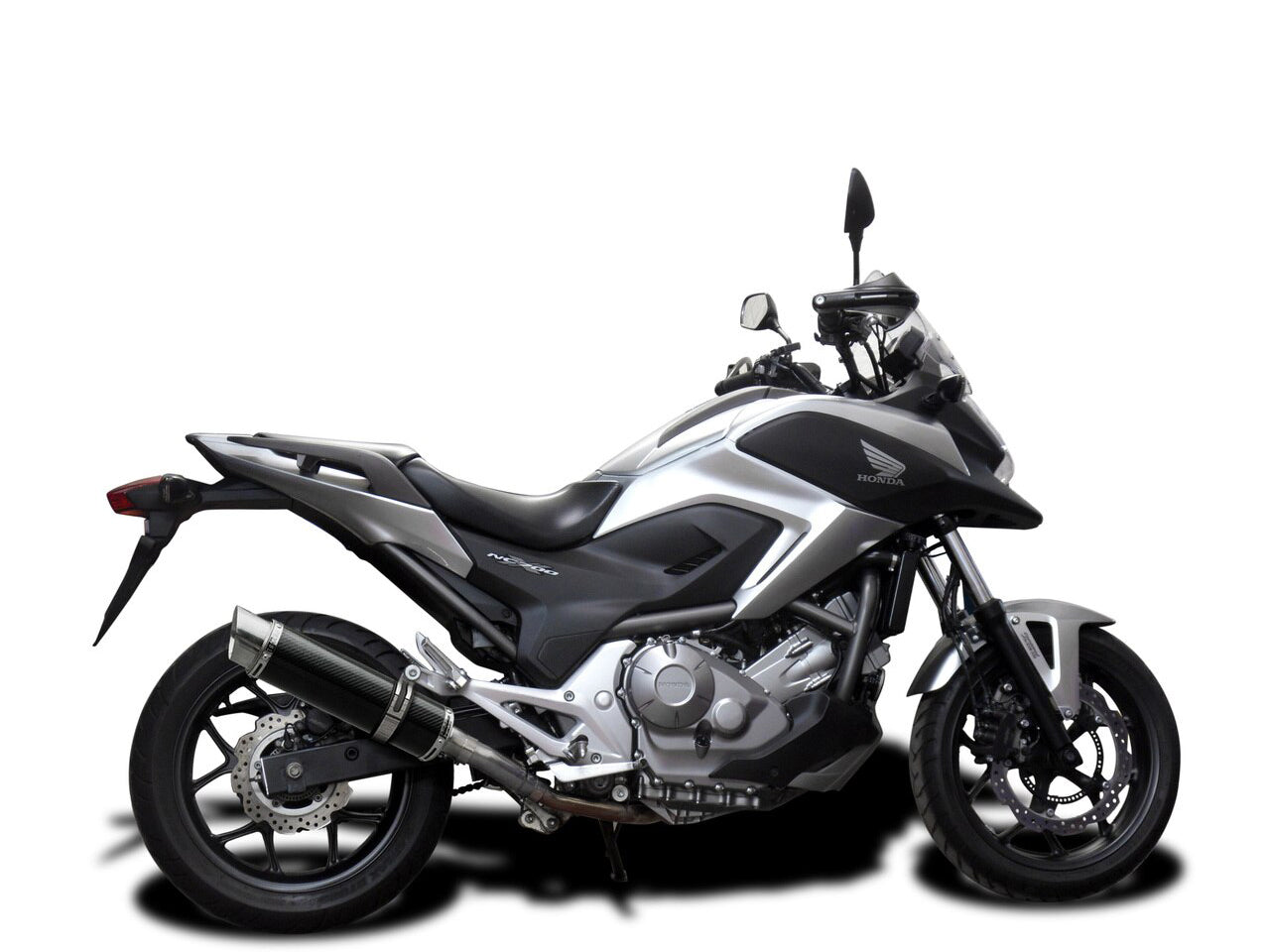 DL10 14" carbon fiber round muffler for Honda NC700X / NC700XD / NC700S / NC700XDH / NC750X by Delkevic.