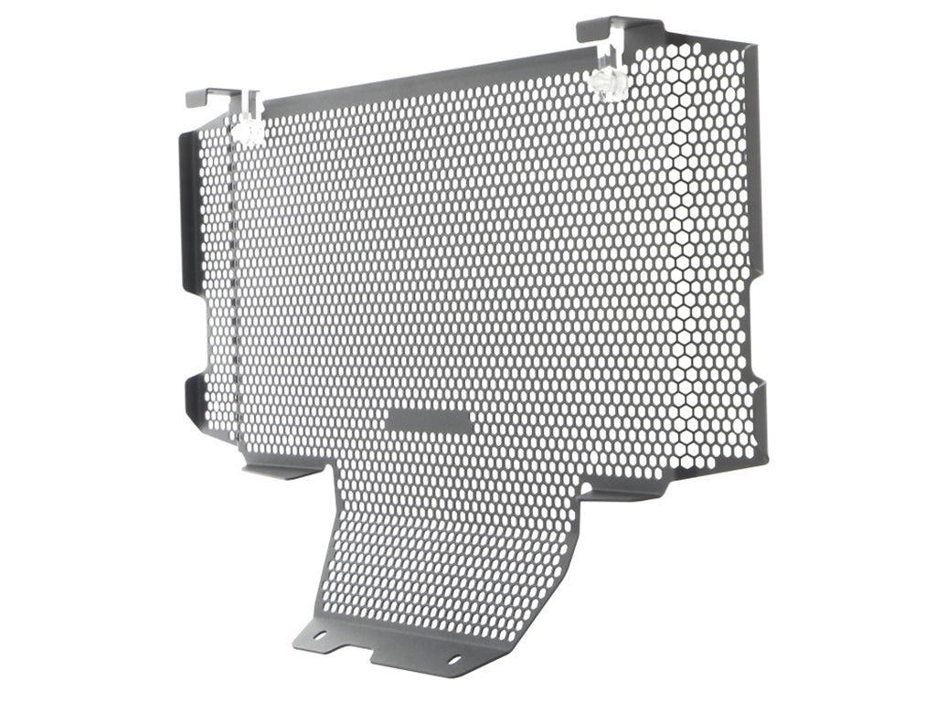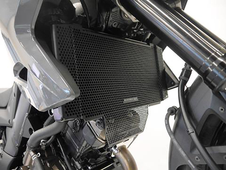 The guard protects the radiator from damage while allowing cooling air to pass through. The radiator’s delicate cooling fins easily bend, and misaligned fins can restrict cooling air, which can lead to overheating. The radiator’s internal waterways are very prone to being holed by stones, debris etc.; all usually picked up and flung directly into the radiator from the front tire or other traffic. Leaking coolant will make the V-Strom 1050 inoperable because of overheating, which can result in engine damage.