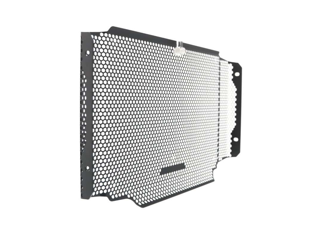 Precision-made radiator guard with high strength to weight ratio mounts in position using existing points on the bike.