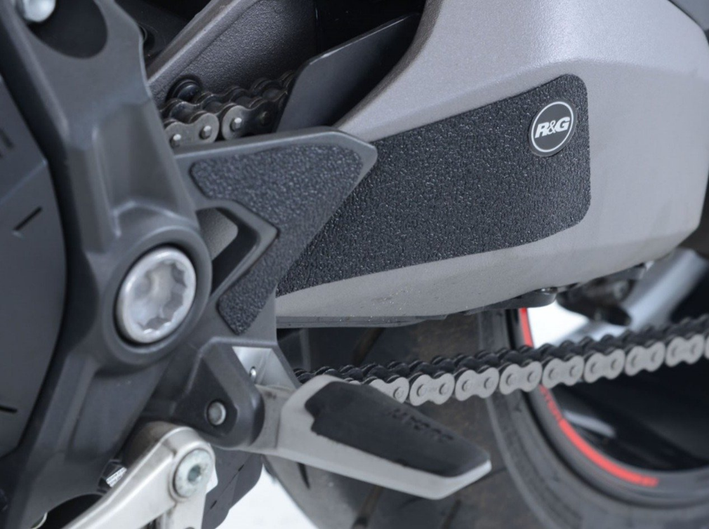 The unique R&G texture was specifically designed to be durable, providing the rider with a buffer between his boot on the exposed areas of the swingarm which can (on occasion) come into contact with each other during cornering causing wear and unwanted damage to the swingarm or boots (both expensive to fix!).