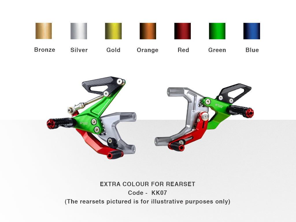 The rearsets use bearings to completely eliminate friction on the foot lever and feature a spring-loaded rear brake lever return. strong, attractive and resistant to mechanical or chemical wear.