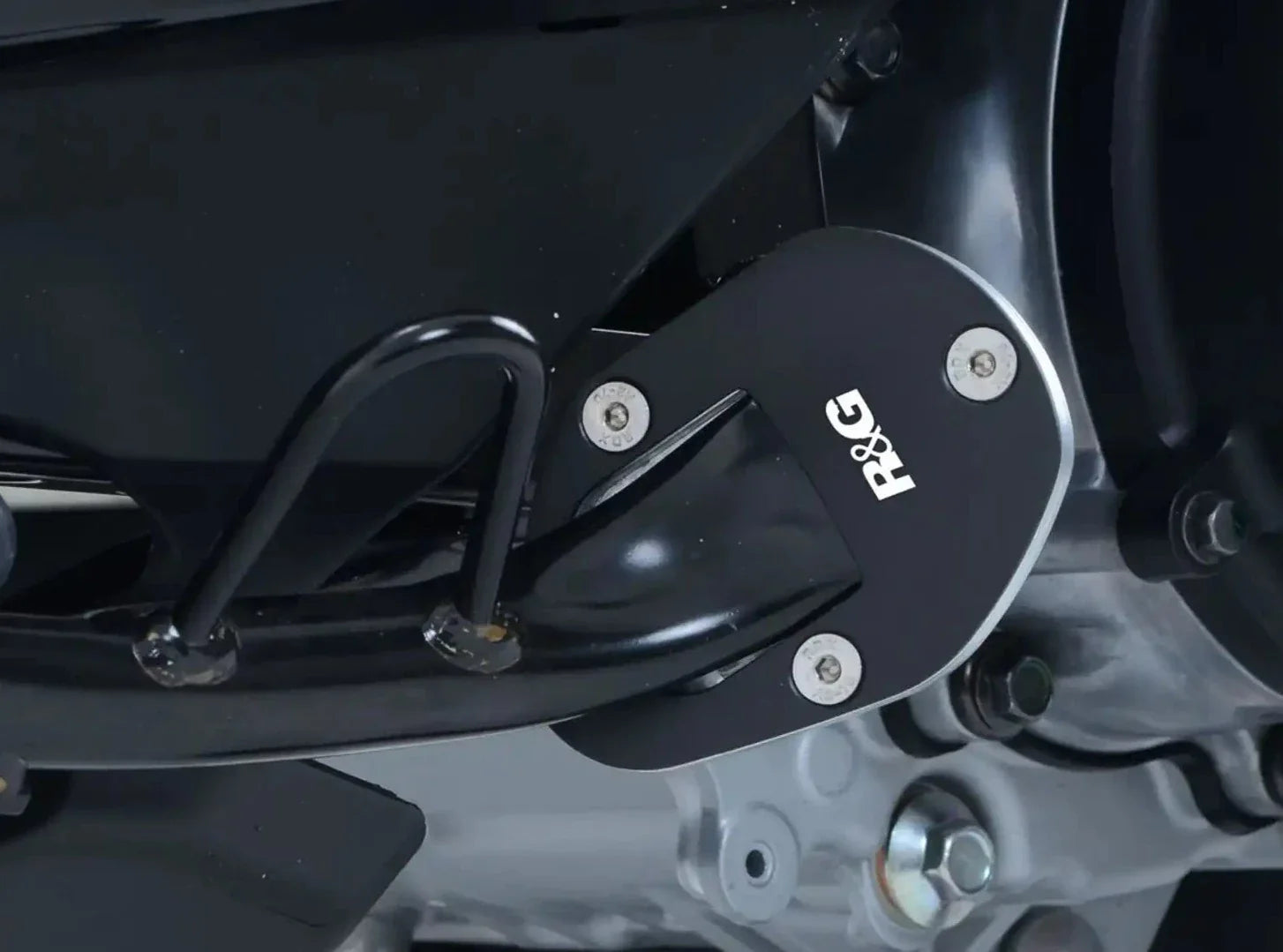 Bolts onto the bottom of the side stand to enlarge the original’s footprint by up to 100%, significantly spreading the load placed upon it, to help prevent the stand ‘piercing’ the ground.