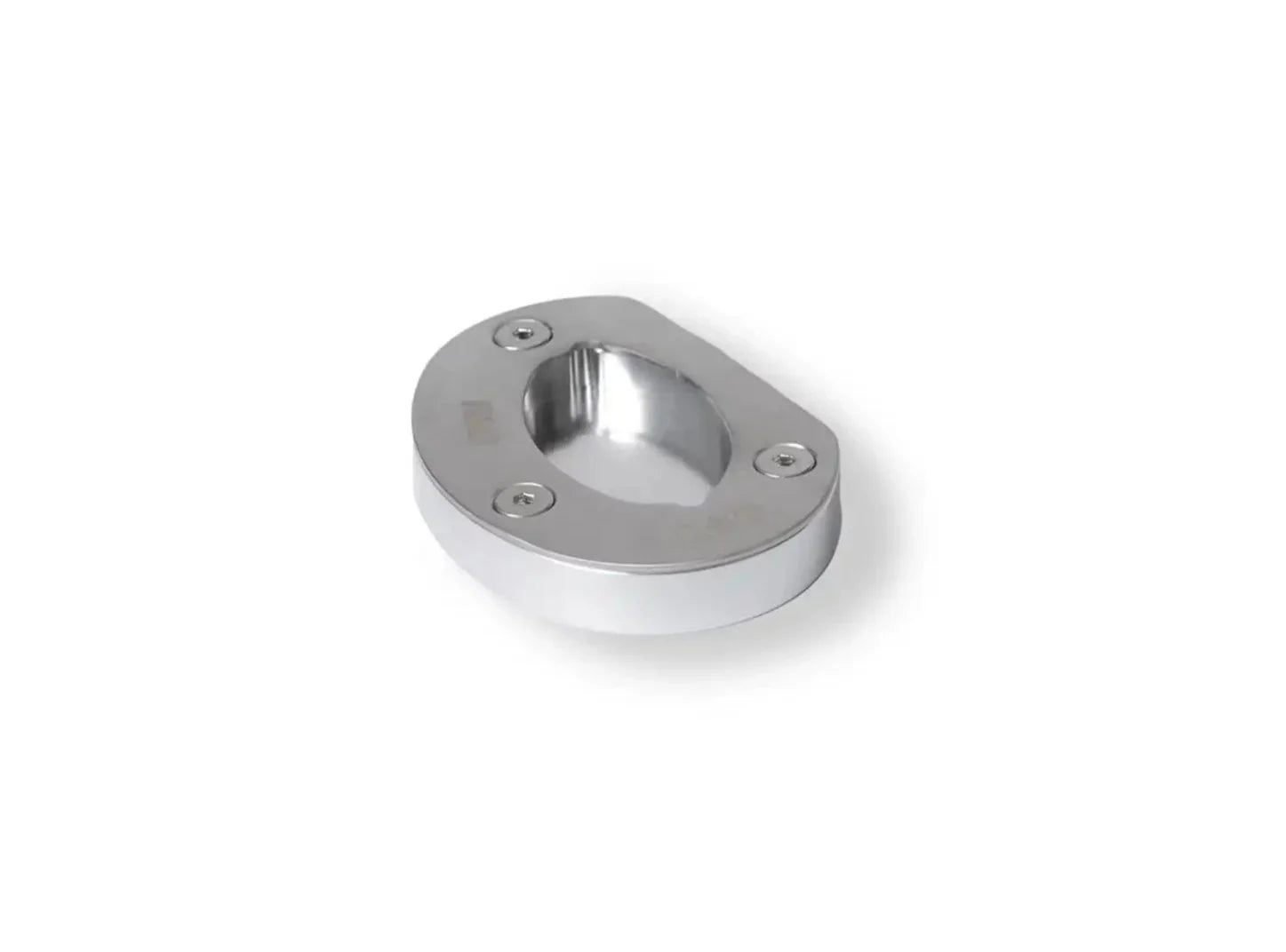 Bolts onto the bottom of the side stand to enlarge the original’s footprint by up to 100%, significantly spreading the load placed upon it, to help prevent the stand ‘piercing’ the ground.