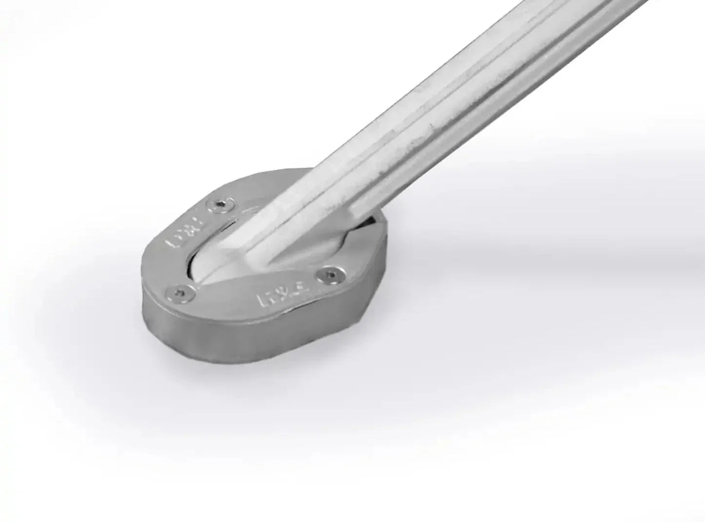 Bolts onto the bottom of the side stand to enlarge the original’s footprint by up to 100%, significantly spreading the load placed upon it, to help prevent the stand ‘piercing’ the ground.