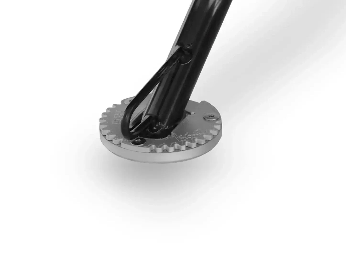 Bolts onto the bottom of the side stand to enlarge the original’s footprint by up to 100%, significantly spreading the load placed upon it, to help prevent the stand ‘piercing’ the ground.