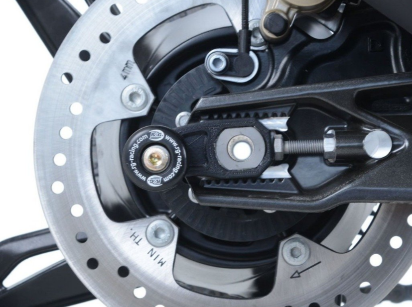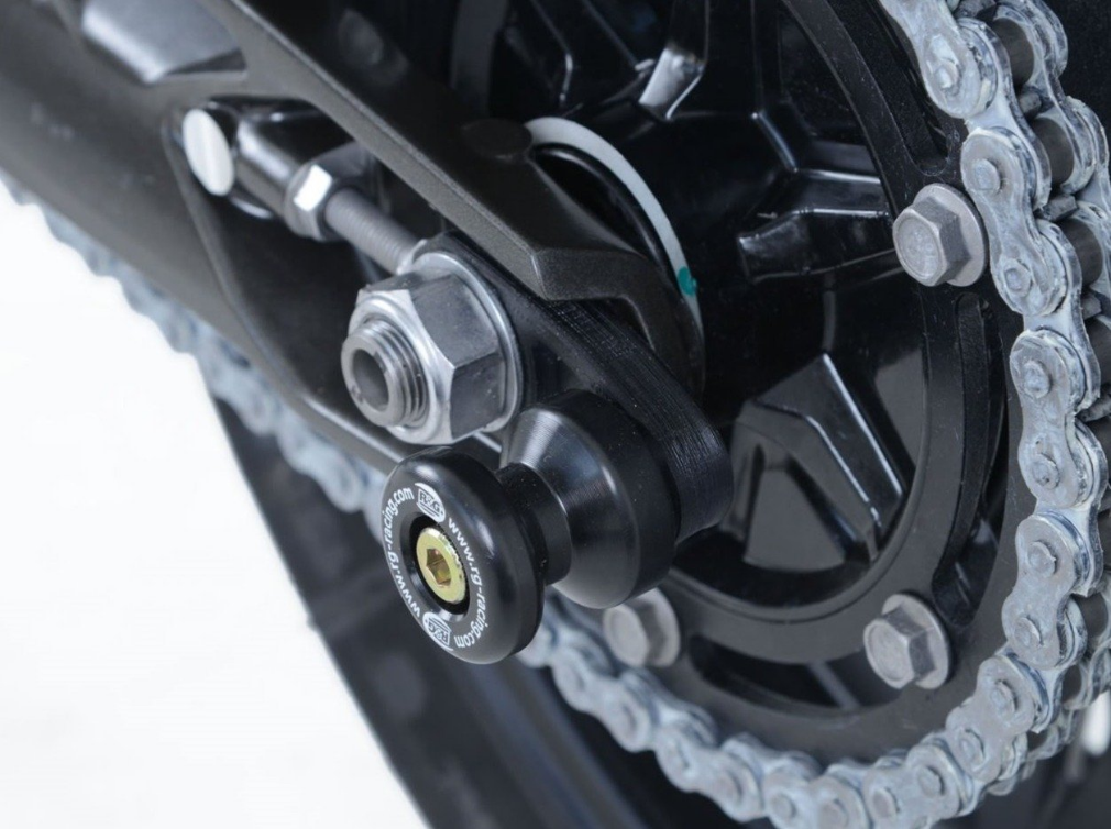 R&G Racing cotton reels locate on the paddock stand mounting points on the rear swingarm, offering protection and functionality in one product.