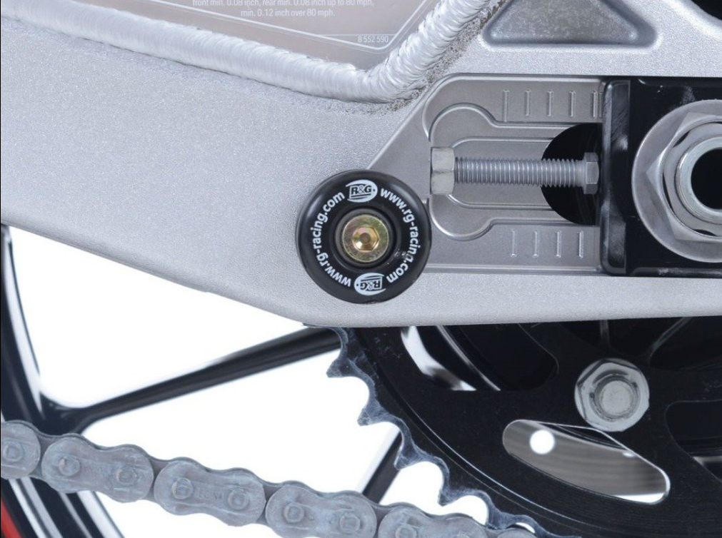R&G Racing cotton reels locate on the paddock stand mounting points on the rear swingarm, offering protection and functionality in one product.