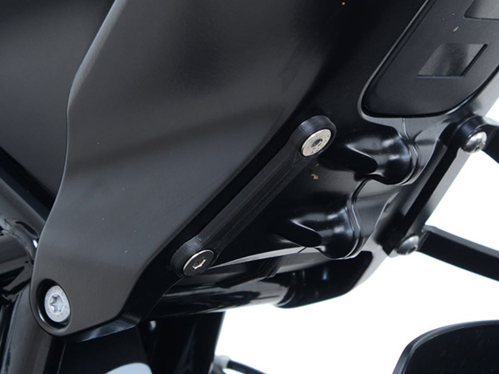 Once you have removed the pillion footrests, fill the void left behind and cover those otherwise exposed holes in the sub-frame with an R&G blanking plate.