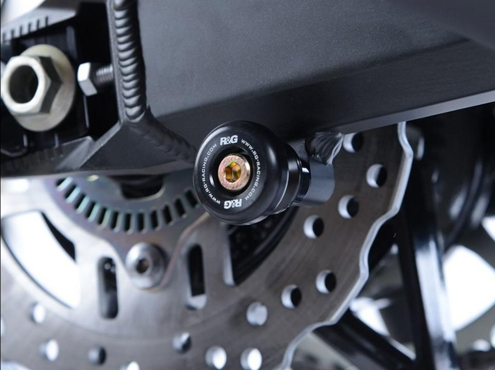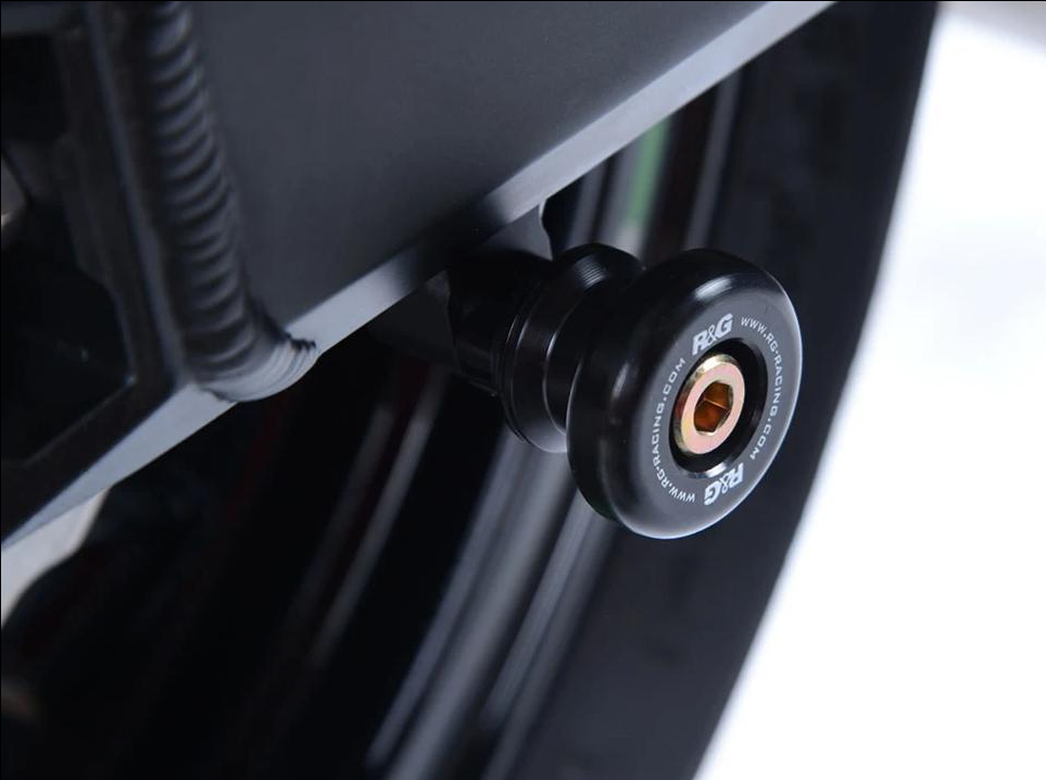 R&G Racing cotton reels locate on the paddock stand mounting points on the rear swingarm, offering protection and functionality in one product.