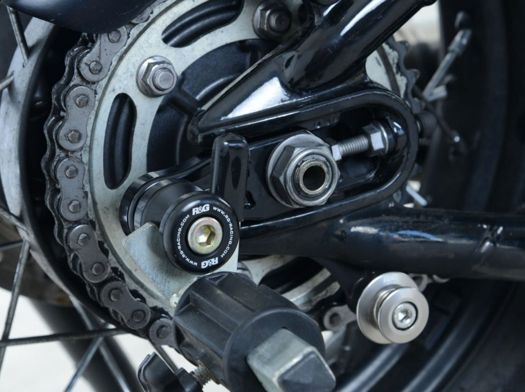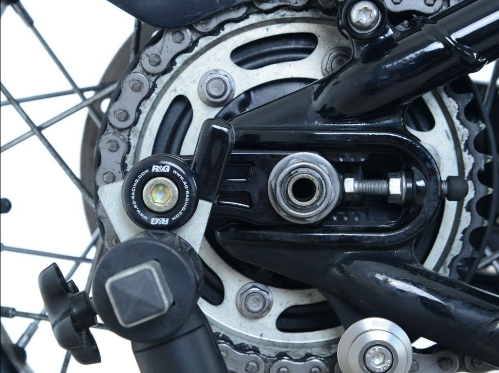 R&G Racing cotton reels locate on the paddock stand mounting points on the rear swingarm, offering protection and functionality in one product.