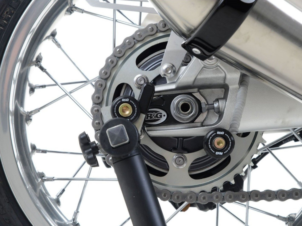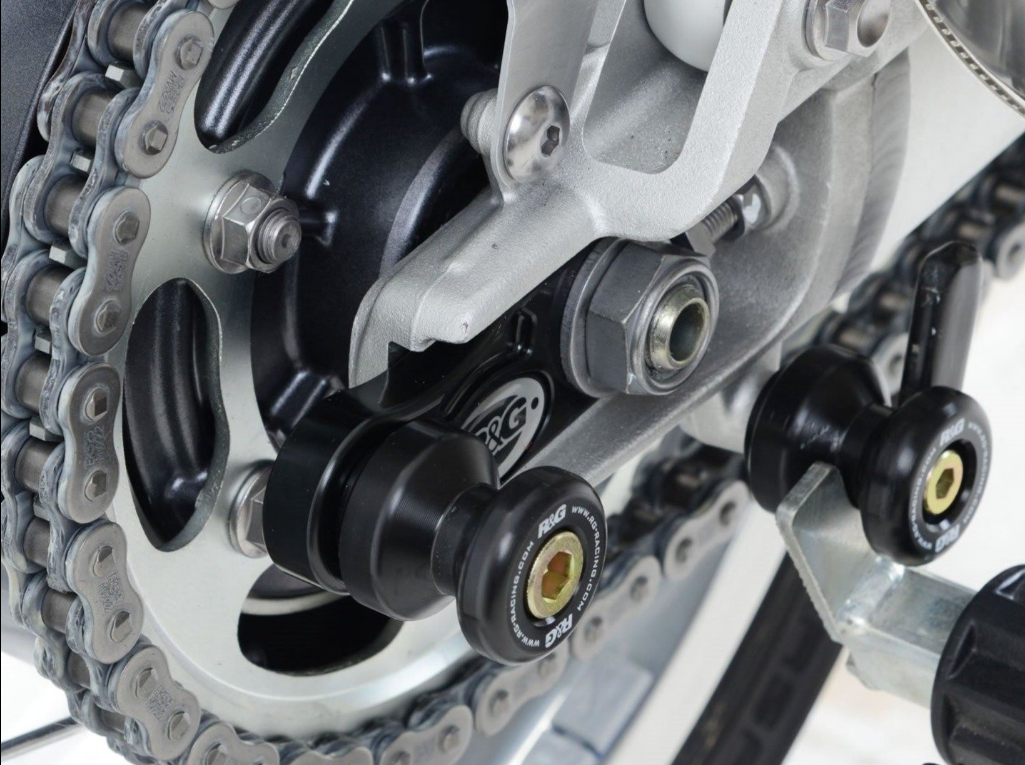 R&G offset cotton reels directly replace the OEM chain adjusters on the rear swingarm, off-setting the cotton reel mounting point from installed directly into the swingarm, instead into a specially machined metal bracket.