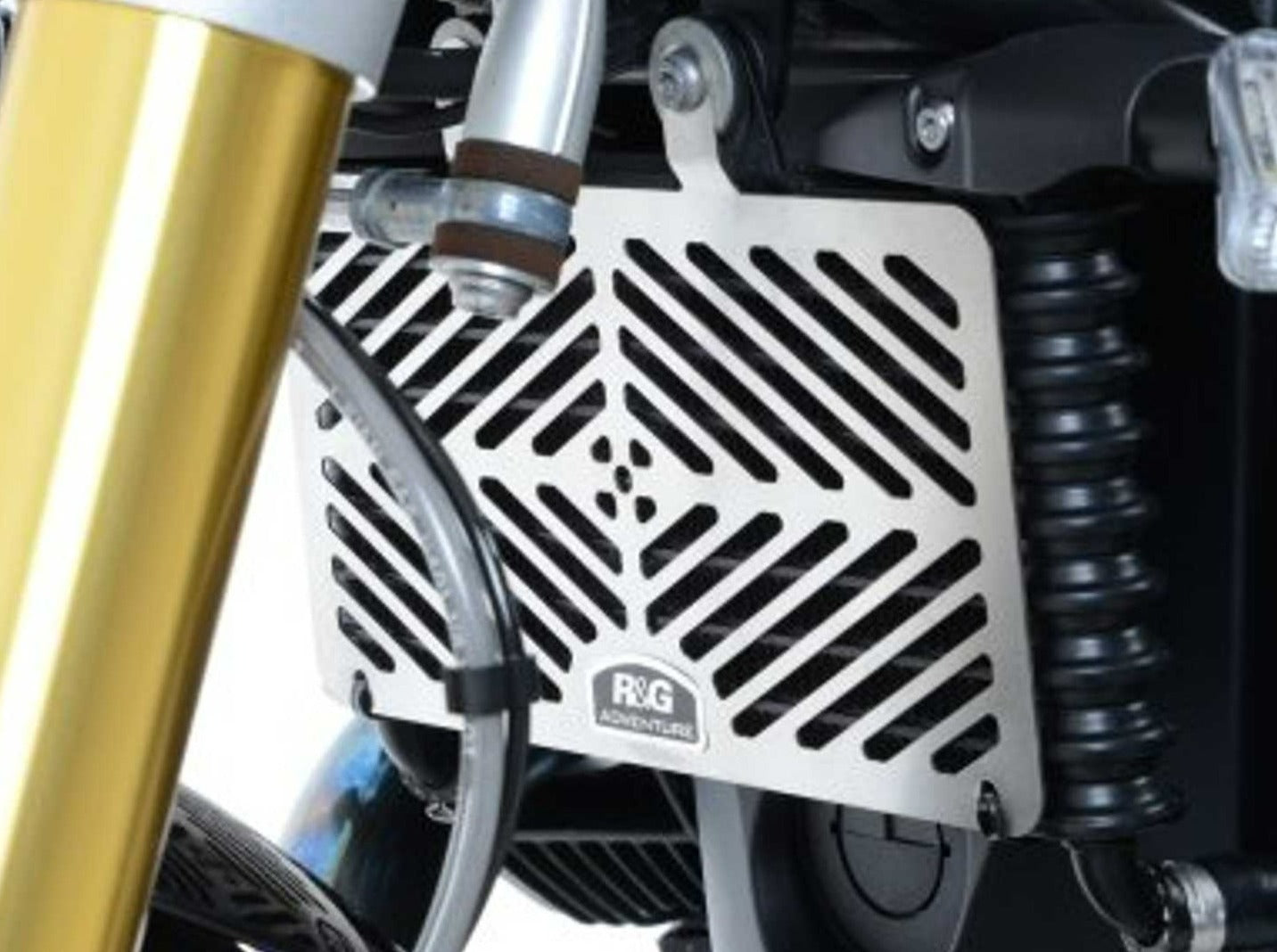 Stainless steel oil cooler guard by R&G Racing for BMW R Nine T.