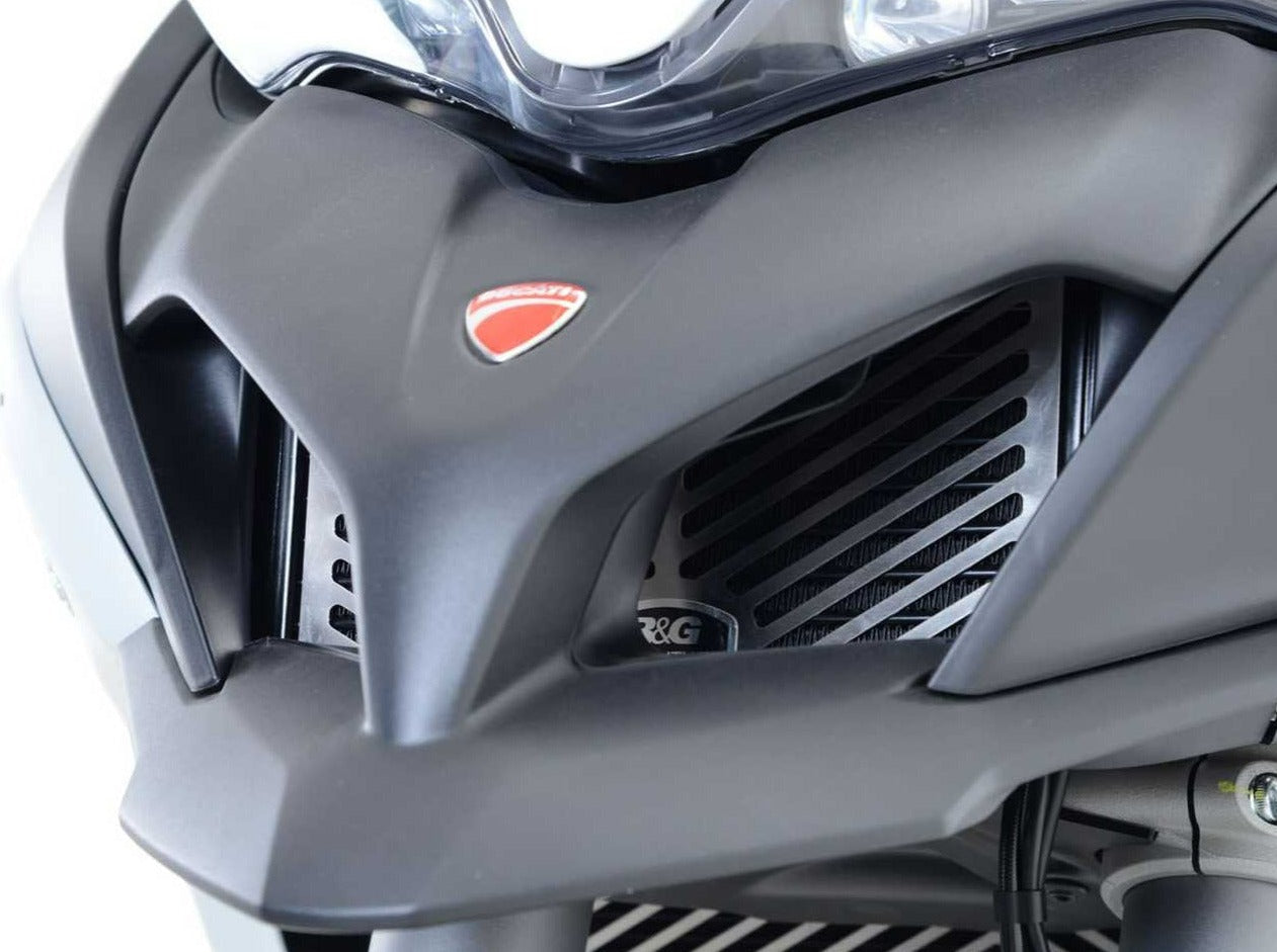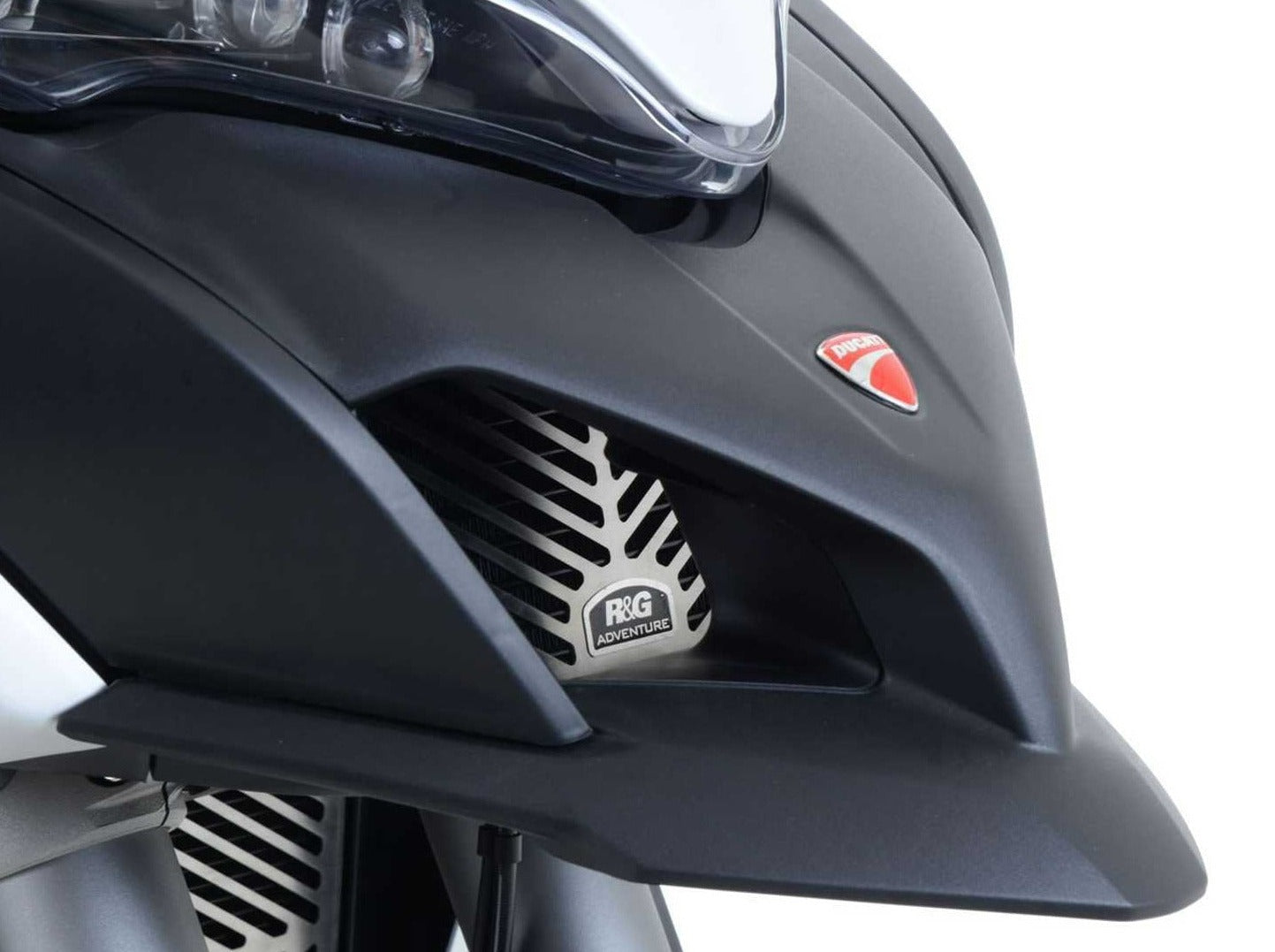 Stainless steel oil cooler guard by R&G Racing for Ducati Multistrada motorcycles.