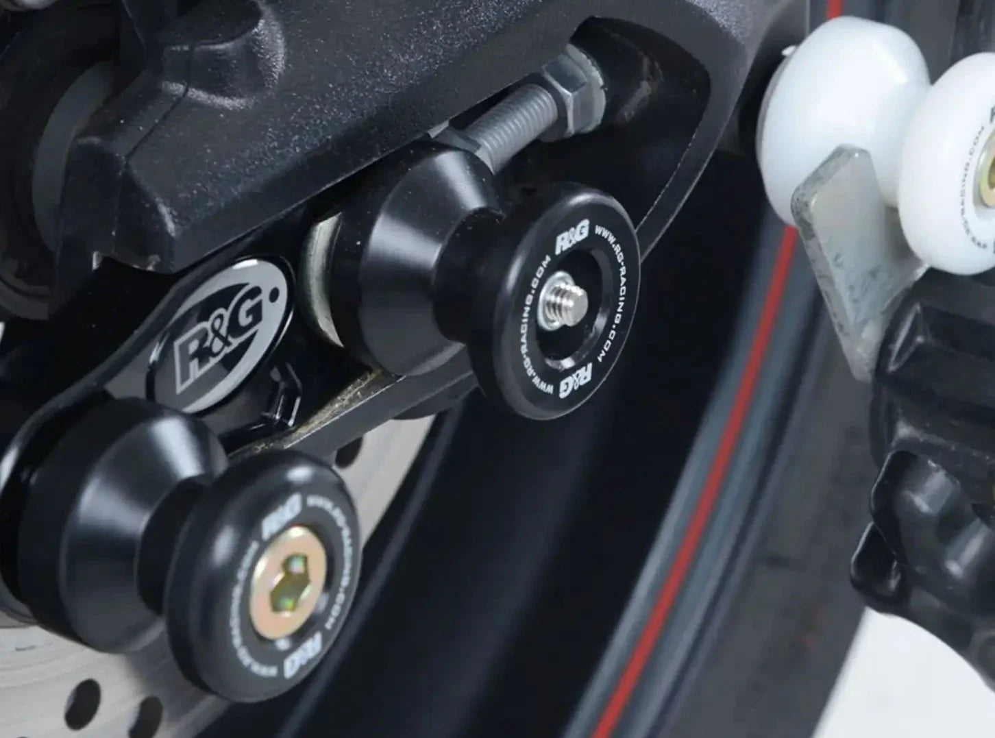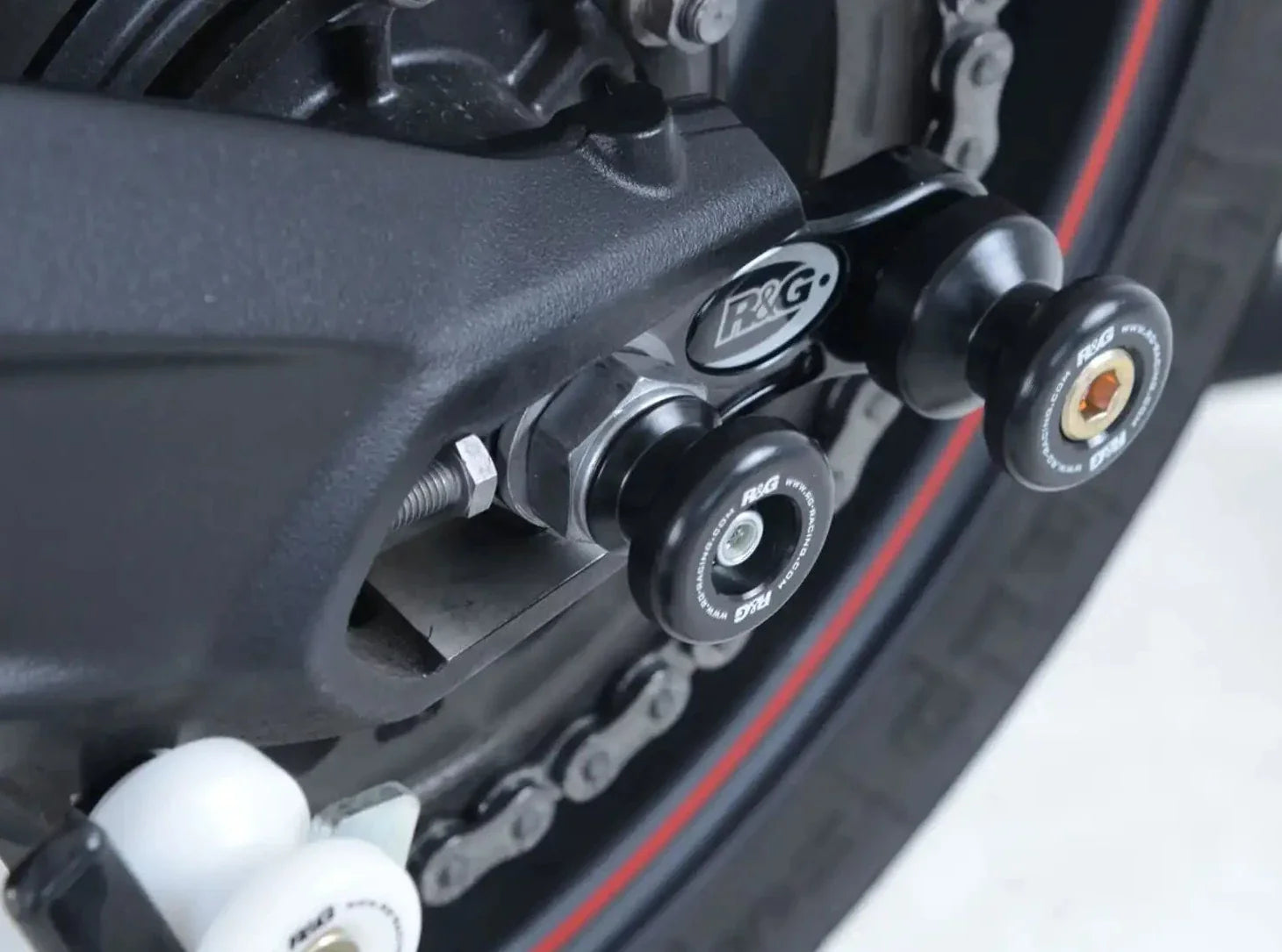 Rear wheel sliders (paddock stand bobbins) by R&G Racing for Triumph motorcycles.