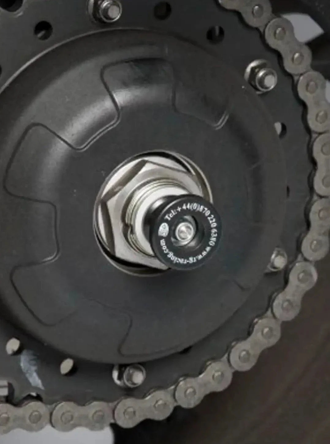These sliders are similar to the cotton reels (paddock stand bobbins), but fit through the rear wheel spindle.