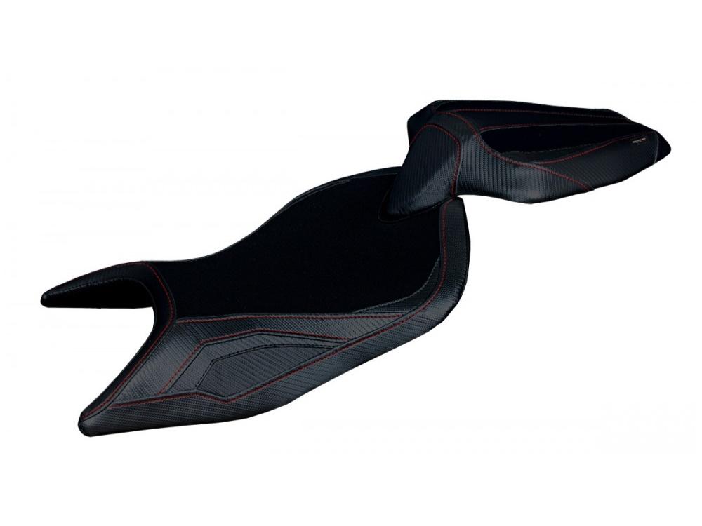 Exclusive seat cover made in black no-slip fabric. Laterals in black carbon look and inserts.