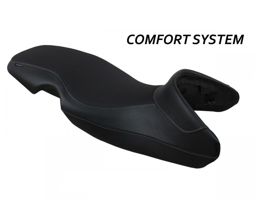 Exclusive seat cover made of black non-slip material. Laterals in black carbon look.