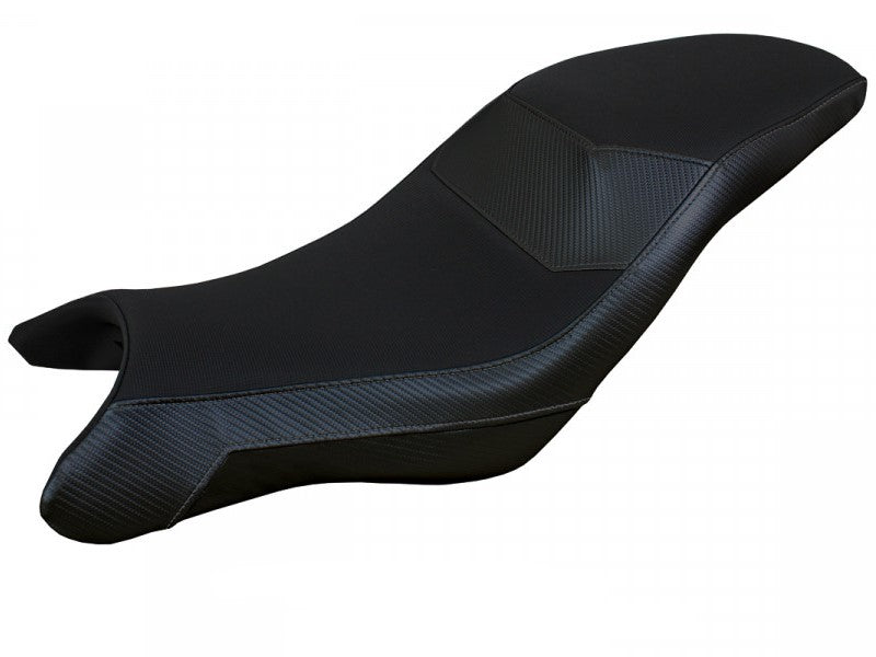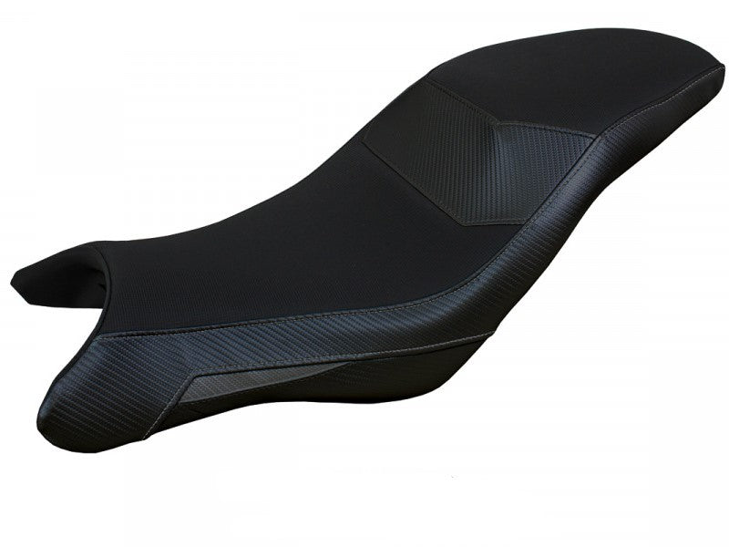 Exclusive seat cover made of black non-slip material. Laterals in black carbon look and inserts.