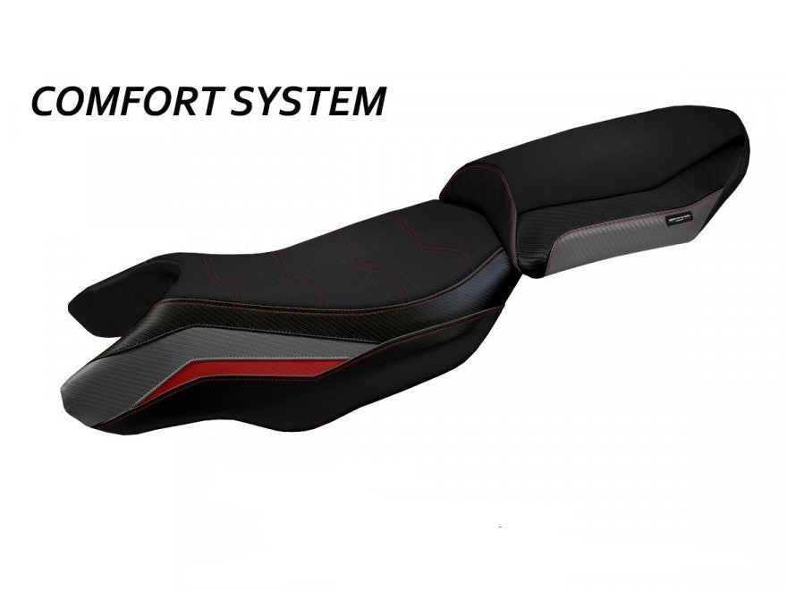 Exclusive seat cover made of black non-slip material. Laterals in black carbon look.