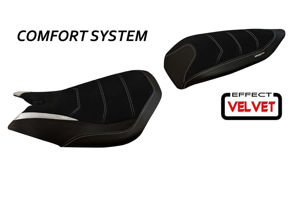 Exclusive seat cover made in black velvet effect above. Laterals in black carbon look and inserts.