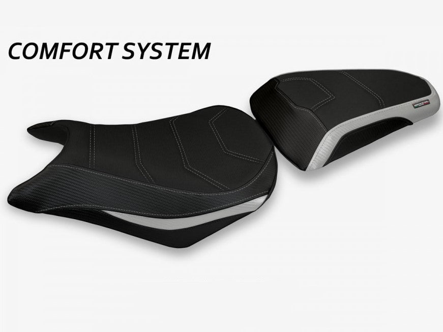 Exclusive seat cover made of black non-slip material. Laterals in black carbon look.
