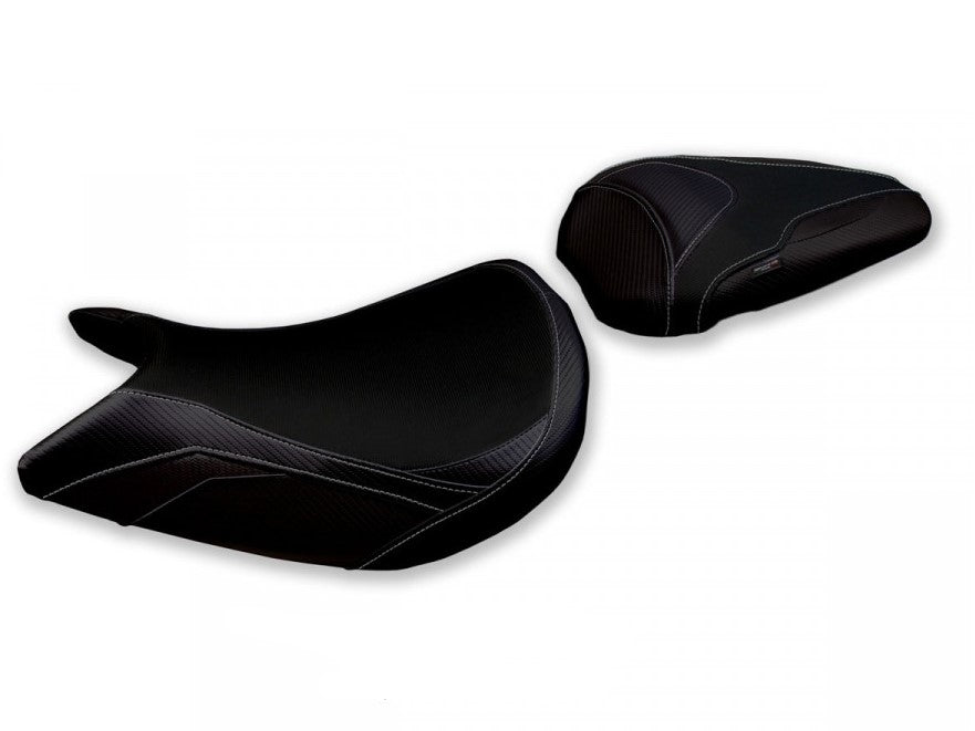 Exclusive seat cover made of black non-slip material. Laterals in black carbon look and inserts.