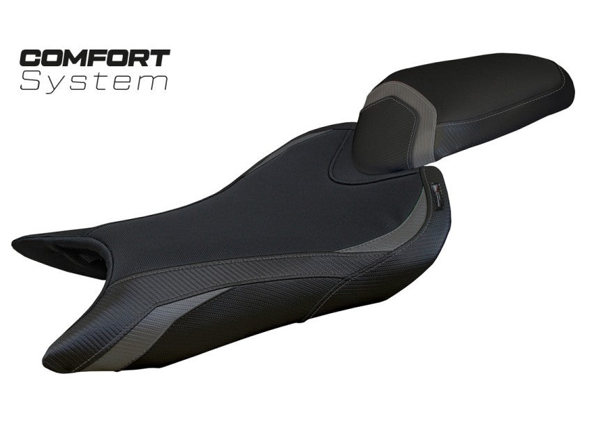 Exclusive seat cover made of black non-slip material. Laterals in black carbon look.