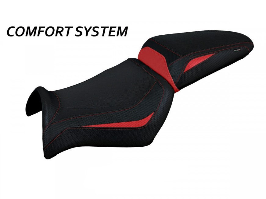 Exclusive seat cover made of black non-slip material. Laterals in black carbon look.