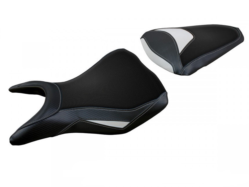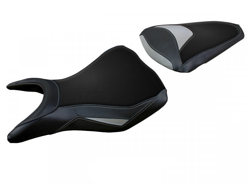 Exclusive seat cover made of black non-slip material. Laterals in black carbon look and inserts.