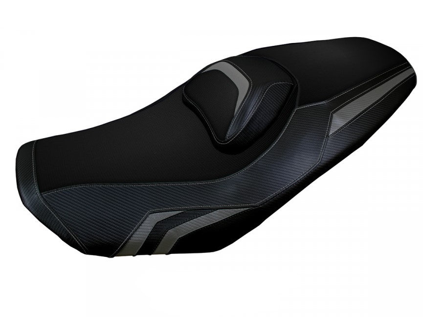 Exclusive seat cover made of black non-slip material. Laterals in black carbon look and inserts.
